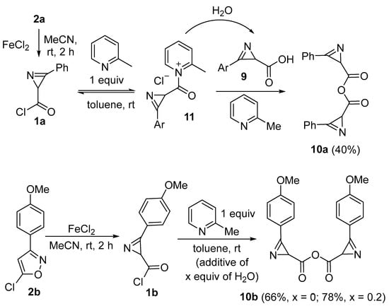 Surprisingly when chloride 1a was treated with 2-picoline without the subsequent addition of any amine, anhydride 10a was obtained in a 40% yield (Scheme 4). Compound 10a was obtained as a mixture of two diastereomers (~1:1.1). (RS,SR)-isomer crystallized from the mixture, and its amazing π-stacked structure was confirmed by X-ray analysis (Figure 1) (See the Supplementary Materials). It was found that chloride 1a does not react with acid 9a to give anhydride 10a in the absence of 2-picoline. A plausible mechanism of the formation of anhydride 10 includes the reaction of salt 11 with acid 9 promoted by 2-picoline. Acid 9 was formed by the hydrolysis of chloride 1 with water adsorbed on the wall of the glassware (the glassware was not specially dried) and traces of water entering the reaction mixture during the isolation of chloride 1 from the mixture obtained after the isomerization of chloroisoxazole 2 (extraction with ether, filtration through celite). Since the scale of the reaction of chloroisoxazole 2a was 1 mmol, only 3.6 mg of water was required to obtain a 40% yield of anhydride 10a. When chloroisoxazole 2b was used in the reaction, anhydride 10b was obtained at 66% (Scheme 4). The addition of 0.2 equiv. of water, together with 2-picoline, increased the yield of anhydride 10b to 78%. Both the excess and deficiency of water in the reaction mixture will reduce the yield of anhydride, but it is difficult to control the exact amount of water required for the reaction on a 1 mmol scale without technically complicating the reaction procedure.
