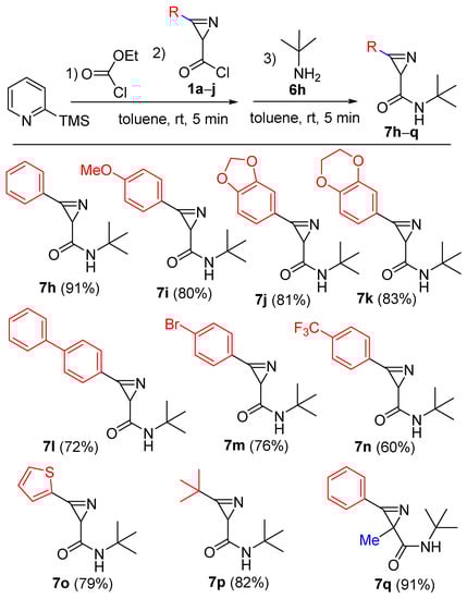 The scope of the reaction with various 2H-azirine-2-carbonyl chlorides 1 was evaluated using tert-butyl amine (6h) as the N-nucleophile. Amides 7h–q were obtained in 60–91% yields (Scheme 6), starting from 3-aryl/hetaryl/alkyl-2H-azirine-2-carbonyl chlorides 1a–i, as well from 2,2,3-trisubstituted derivative 1j. All new compounds were characterized by 1H, 13C NMR, and HRMS methods. Moreover, the structure of 7n was also confirmed by single-crystal X-ray diffraction analysis (Figure 2) (See the Supplementary Materials).