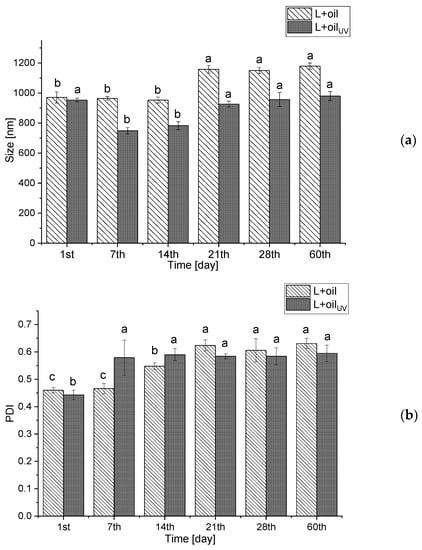 As can be seen in Table 2, the density of the oil-loaded liposomes was 0.974 ± 0.003 g/cm3 for the non-treated and 0.959 ± 0.001 g/cm3 for the UV-irradiated, whereas the plain liposomes have shown a significantly higher density, 0.995 ± 0.003 g/cm3 and 0.974 ± 0.004 g/cm3 for the non-treated and the UV-irradiated samples. The surface tension of the oil-loaded liposomes was 20.3 ± 1.0 mN/m for the non-treated and 23.1 ± 0.2 mN/m for the UV-irradiated, while the unloaded liposomes had a significantly different surface tension, 19.7 ± 0.9 mN/m for the non-treated and 21.4 ± 0.5 mN/m for the UV-irradiated. The viscosity of the oil-loaded liposomes was 13.5 ± 0.2 mPa•s for the non-treated and 20.2 ± 0.1 mPa•s for the UV-irradiated, while the viscosity of the empty liposomes was 13.9 ± 0.2 mPa•s for the non-treated and 20.7 ± 0.4 mPa•s for the UV-irradiated. Further, the density and surface tension of the pure oil were 0.914 ± 0.001 g/cm3 and 30.0 ± 0.8 mN/m for the non-treated and 0.915 ± 0.002 g/cm3 and 28.0 ± 0.9 mN/m for the UV-irradiated, while viscosity was 50.9 ± 0.3 mPa•s for the non-treated and 45.7 ± 0.1 mPa•s for the UV-irradiated. In the case of the pure oil, the UV irradiation has caused a decrease in the surface tension and viscosity values. Moreover, it was the opposite in the oil-loaded liposomes, where the UV-irradiated samples possessed a higher surface tension and viscosity, probably due to water evaporation during 30 min of UV irradiation. The values of the density and surface tension did not change after the 60th day in the non-treated and UV-irradiated oil-loaded liposomes (0.969 ± 0.003 and 0.962 ± 0.003 g/cm3 and 20.1 ± 1.5 and 23.4 ± 1.5 mN/m, respectively), while the viscosity significantly decreased (6.7 ± 0.4 and 11.4 ± 0.5 mPa•s), probably due to the hydrolytic reactions characteristic of an aqueous medium.