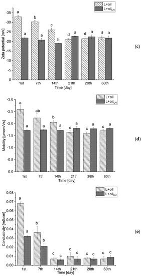Liposome size (a), polydispersity index (b), zeta potential (c), mobility (d), and conductivity (e) of the non-treated and UV-irradiated Rosa canina seed oil-loaded liposomes during 60 days storage at 4 °C; values with different letters (a–d) in each row showed statistically significant differences (p < 0.05; n = 3; analysis of variance, Duncan’s post-hoc test); L, liposomes.