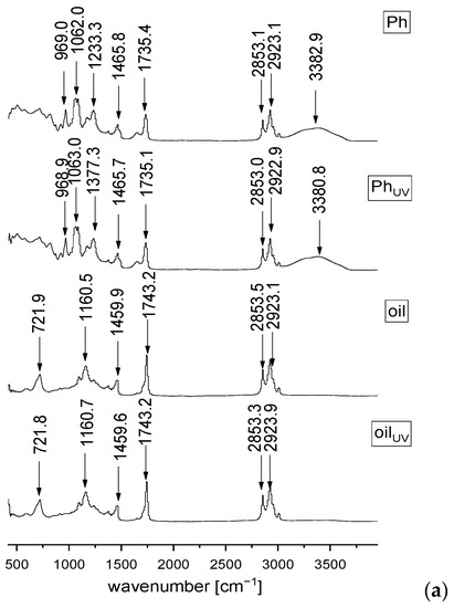 FT−IR spectra of the non-treated and UV-irradiated (a) Ph (a commercial phospholipids mixture) and Rosa canina seed oil, and (b) the plain and oil-loaded liposomes in the spectral range from 450 to 4000 cm−1; L, liposomes.