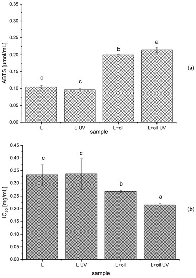 Antioxidant capacity of the empty and Rosa canina seed oil-loaded liposomes (non-treated and UV-irradiated) obtained in the ABTS (a) and DPPH (b) assays; IC50, the concentration of the liposomes required to scavenge 50% of the DPPH radicals; values with different letters (a–c) showed statistically significant differences (p < 0.05; n = 3; analysis of variance, Duncan’s post-hoc test).