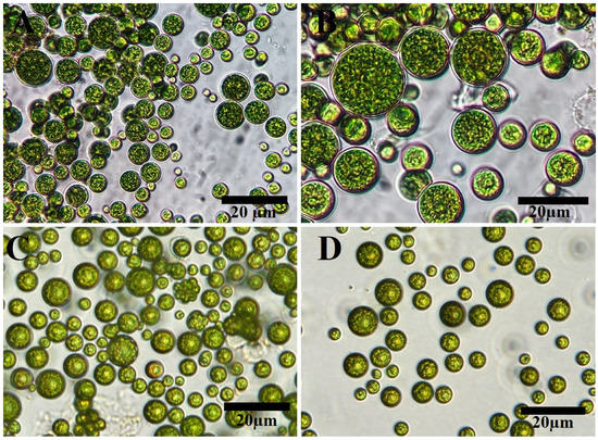 Light and inverted light micrographs revealed that the unicellular ulvophyte sp. MBIC10591 was spherical. Several unicellular vegetative cells were detected with cup-shaped spongiomorph chloroplasts with pyrenoids surrounded by several starch grains. Single cells were the most dominant; however, package cells with parenchyma-like structures containing more daughter cells were detected. All cells were surrounded by thick cell walls (Figure 1A–D). SEM micrographs showed cells with widely ellipsoidal to spherical shapes with sizes of 13.8 × 12.7 µm. Several irregular ribs existed on algal surfaces, and parenchyma-like structure package cells with more than nine daughter cells were observed (Figure 2A–D). The daughter cells were surrounded by thick cell walls. Unfortunately, no publications have demonstrated the morphological appearance of this isolate. The strain was deposited in 2001 for the first time by Japanese scientists Suda et al. in GenBank with the accession number AB058370. However, the current isolate shared several features with Desmochloris sp. in that its cells are distinguished by their spherical to ellipsoidal shapes and cup-shaped spongiomorph chloroplasts [29,30].