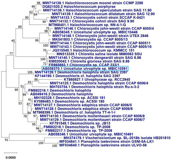 Phylogenetic tree of the unicellular ulvophyte sp. MBIC10591 (blue frame) inferred from 18S r RNA. Tree was constructed by cluster method using MEGA4 software version 10.2.6. Number at each branch refers to the bootstrap values for % of 1000 replicate trees calculated by neighbour joining statistical method.