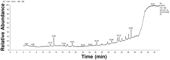 The GC-MS chromatograph demonstrated, for the first time, the volatile organic molecules of the watery unicellular ulvophyte sp. MBIC10591 extract with a retention time of 4–44 min. The data showed 34 peaks corresponding to 24 algal bio-compounds. These 24 biomolecules included fatty acids (FA), FA esters, vitamins, alcohols, phenols, hydrocarbons, organosulphur compounds, amino-acid-like compounds, and polysaccharides (Table 1 and Figure 4). It was found that the unicellular ulvophyte sp. MBIC10591 was enriched with various molecules that act as antioxidant, antimicrobial, anticancer, and anti-hypercholesterolemic agents such as D-fructose, diethyl mercaptal, pentaacetate, 25,26,27-trinorcholecalcifer-24-al, trisulphide, and di-2-propenyl, among others [30,31,32]. Based on the GC-MS spectra, the main organic molecules were speculated to be lipids and hydrocarbons that could precipitate while stabilising NPs. However, the existence of alcohols and phenols may indicate that hydroxyl groups have significant roles in the biogenesis of Uv@Ag-NPs. Olasehinde et al. analysed the ethanolic and dichloromethane extracts of Chlorella sorokiniana and Chlorella minutissima and found that the microalgae were enriched with phenols, sterols, steroids, fatty acids, and terpenes that have modulatory activities for some mediators of Alzheimer’s disease [33]. GC-MS analysis of the aqueous extract of Coelastrella aeroterrestrica BA_Chlo4 showed that the dominant biomolecules of the algal extract were fatty acids and hydrocarbons [12].