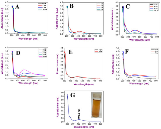 To obtain smaller nanoparticles with high stability, various parameters were studied, including precursor concentrations, the ratio between algal extract and precursor, temperature, pH, illumination, and time of incubation (Figure 5A–G).