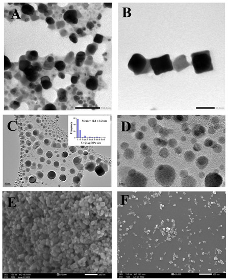 TEM (A,B), HR-TEM (C,D), and SEM (E,F) micrographs of Uv@Ag-NPs illustrate the uniform distribution of Uv@Ag-NPs and their spherical and cubic shapes. Scale bar = 100 nm (A), 50 nm (B,C), 5 nm (D), 200 nm (E), and 500 nm (F).