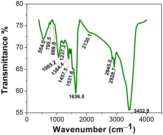 The FTIR of the Uv@Ag-NPs contained 13 peaks at 3432.9 [41], 2928.7 [43], 2845.0 [44], 2130.1, 1636.5 [45], 1531.6, 1457.5 [46], 1384.4 [47], 1237.2 [48], 1085.2 [49], 889.8, 795.5 [50], and 554.0 [51] cm−1 (Figure 8). The IR peaks at 3432.9, 2928.7, and 2845.0 cm−1 corresponded to strong broad O-H stretching of alcohols or medium N-H stretching of primary amines and strong broad O-H stretching of carboxylics, broad N-H stretching of amine salts, or medium C-H stretching of alkane. However, the peaks at 2130.1, 1636.5, and 1531.6 cm−1 referred to the strong N=N=N stretching of azides, N=C=N stretching of carbodiimides, or N=C=S stretching of isothiocyanates or weak CΞC of alkynes; medium C=C stretching of alkenes or N-H stretching of amines; and strong N-O stretching of nitrocompounds. The peaks at 1457.5, 1384.4, 1237.2, and 1085.2 cm−1 were related to the medium C-H bending of alkanes; medium C-H bending of alkanes, O-H bending of alcohols, or strong S=O stretching of sulphates; strong C-O stretching of alkyls or medium C-N stretching of amines; and strong C-O stretching of primary alcohols or aliphatic ethers. The FTIR spectra at 889.8, 795.5, and 554.0 cm−1 were related to strong or medium C=C bending of alkenes and strong C-I stretching of halocompounds. These data may indicate that the main molecules for capping Uv@Ag-NPs were proteins and/or polysaccharides and/or alcohols, while the stabilising molecules were hydrocarbons and/or fatty acids. These data may be supported by the data of GC-MS analysis, which indicated that the main stabilising agents were fatty acids and hydrocarbons, and that phenol, alcohols, and/or amino-acid-like compounds were the reducing agents. Mahajan et al. extracellularly biofabricated Ag-NPs from silver nitrate using Chlorella vulgaris [52]. They analysed the functional group on the Ag-NPs using FTIR and found that the IR peaks of Ag-NPs were at 3435.88, 2092.30, 1637.82, 1559.61, 1414.42, 1037.17, and 618.16 cm−1. This suggested that proteins, polysaccharides, and amides were significant passivating biomolecules for the bioreduction of AgNO3 to Ag-NPs, while long-chain fatty acids were the stabilising agents.