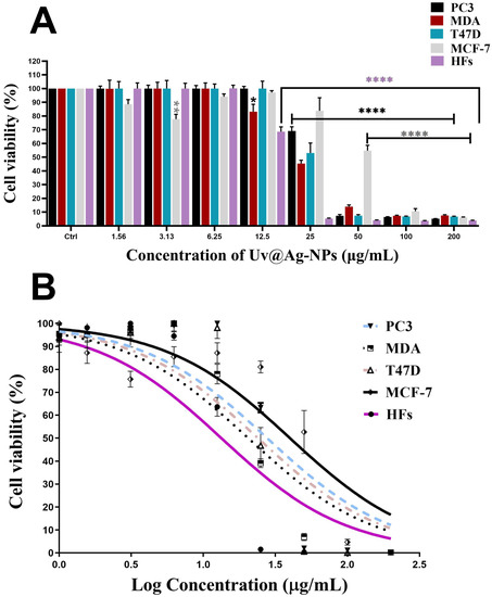 The antiproliferative activities of Uv@Ag-NPs, Ch@Ag-NPs, and 5-FU (as positive controls) were screened against four malignant cell lines, namely PC3, MCF-7, MDA-MB-231, and T47D, and one normal cell line, HFs, using the MTT kit. In brief, a cell density of 5 × 104 cells/mL was seeded onto a 96-well plate and incubated in a 5% CO2 incubator for 24 h at 37 °C. At 75% confluency, the cells were subjected to serial dilution of Uv@Ag-NPs (200, 100, 50, 25, 12.5, 3.1, and 1.6 µg/mL), while the concentrations of both Ch@Ag-NPs and 5-FU were 1000, 500, 250, 125, 62.5, 31.25, 15.62, 7.81, and 3.90 μg/mL. Uv@Ag-NPs, Ch@Ag-NPs, and 5-FU were suspended in DMEM media, and the NP suspension was sonicated for 15 min. The 5-FU mixture was vortexed for 1 min. All mixtures were filtered using a 0.45 μm syringe filter for direct application to cells. The treated plates were incubated for 24 h in a 5% CO2 incubator at 37 °C. After incubation, the media were discarded and replaced with 100 μL/well fresh media, and 10 μL/well of MTT solution (5 mg of MTT powder dissolved in 1 mL of sterile PBS, vortexed until dissolution, and filtered using a syringe filter) was added. The plates were incubated for 4 h, and the media was removed. Subsequently, 100 μL/well of DMSO was applied, and the plates were shacked at 400 rpm for 15 min to dissolve the formazan dye crystal. The plates were read on a Hercules, CA, USA) at 570 nm [3]. Cell viability (%) was estimated according to the following equation: