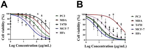 Antiproliferative activity (A,B) of a twofold serial dilution of 200 µg/mL of Uv@Ag-NPs synthesised from the unicellular ulvophyte sp. MBIC10591 against four malignant cells, PC3, MDA-MB-231, T47D, and MCF-7, and normal cells, HFs. Data are represented as mean ± SEM. p-values were calculated versus untreated cells: **** p < 0.0001, ** p < 0.001, and * p < 0.01.