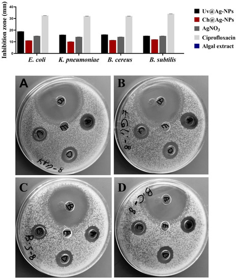 Inhibitory activities of 1 mg/mL of Uv@Ag-NPs, Ch@Ag-NPs, AgNO3, algal extract, and ciprofloxacin against E. coli, K. pneumoniae, B. cereus, and B. subtilis. Letters written on well refer to (A) Uv@Ag-NPs, (B) ciprofloxacin, (C) Ch@Ag-NPs, (D) AgNO3, and (E) algal extract.