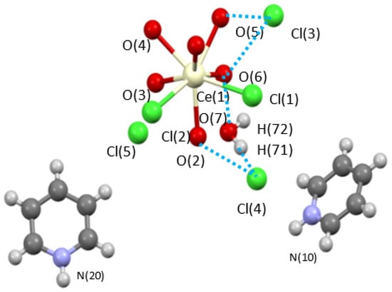 Ball and stick structure plot of [Ce(Cl)2(OH2)6][py-H]2[Cl]3(H2O) (Ce-H2O/py-H). Blue dashed line represents H-bonding.