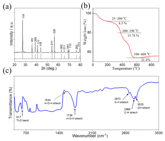 (a) XRD patterns of TiO2; (b) TGA curve of TiO2; (c) FTIR spectra.