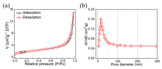 The N2 adsorption/desorption isotherms of TiO2 are shown in Figure 4a, which exhibit a hysteresis loop at P/Po > 0.7 and confirm a typical type IV adsorption behavior, indicating that TiO2 likely possesses a mesoporous structure. Furthermore, when the relative pressure P/Po > 0.8, the adsorption/desorption isotherm was steep because, during cohesion and evaporation, the relative pressure was centered, suggesting that the TiO2 exhibited mesoporous characteristics. The BET-specific surface area of TiO2 was calculated to be 17.613 m2/g [28].