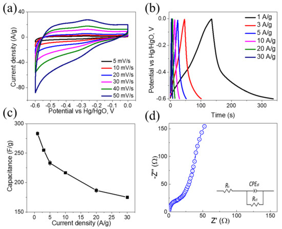 The constant consumption of conventional fossil fuels and the resulting increase in environmental problems have made the development of low-carbon emissions and environmentally friendly methods of energy storage an urgent necessity [1,2]. Supercapacitors (SCs) have led to their widespread consideration as renewable sources due to the favorable electrochemical performance of rapid charging/discharging methods, high power density, and extended cycle stability [3,4]. Depending on their charge storage mechanism, SCs are classified as electric double-layer capacitors (EDLCs) or pseudocapacitors (PCs) [5]. Compared to EDLCs, PCs can offer diverse redox states and achieve high specific capacitance because of the reversible redox reactions at the electrode/electrolyte interface and on the active materials’ surfaces [6].