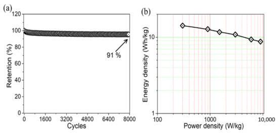 The following Equations (2) and (3) were used to calculate the energy density E (Wh/kg) and the power density P (kW/kg). Where Csp is the electrode’s specific capacitance and ΔV is the potential, td is the discharge time.