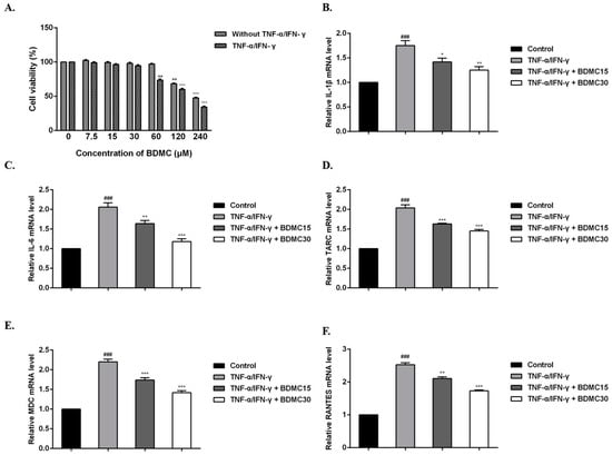 Effects of BDMC on mRNA expression of cytokines and chemokines in HaCaT cells. (A) Cells were treated with different concentrations of BDMC (with/without TNF-α/IFN-γ) at 37 °C for 24 h, and then the cell viability was examined by MTT assay. Cells were treated with TNF-α (10 ng/mL)/IFN-γ (10 ng/mL) or equal volume Phosphate Buffered Saline for 24 h; meanwhile, different concentrations of BDMC (15 and 30 µM) were added. Further, the mRNA expression levels of (B) IL-1β, (C) IL-6, (D) TARC, (E) MDC, and (F) RANTES were determined using RT-qPCR. The RNA gene expression levels of each sample were analyzed three times and normalized to the internal control gene GAPDH. The values are expressed as the means ± standard deviation (SD) of three independent samples. ### p < 0.001 vs. control group; * p < 0.05, ** p < 0.01, *** p < 0.001 vs. TNF-α/IFN-γ group.