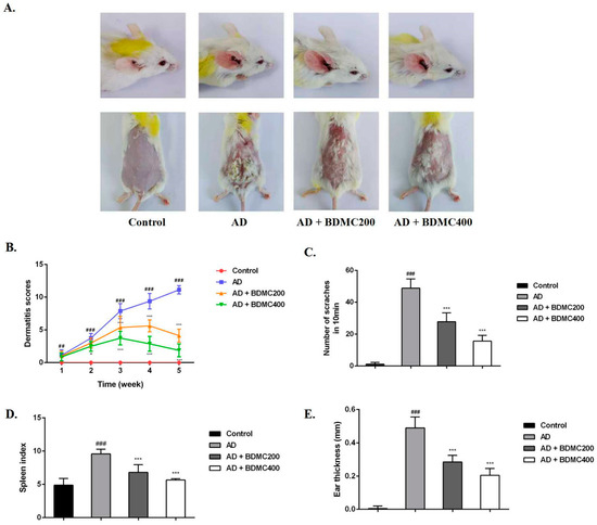 Effects of BDMC on the clinical symptoms of AD-like skin lesions. (A) Representative image of AD-like skin and ear lesions on the last day. (B) The dermatitis score, including dryness, edema, erythema, and erosion, was calculated once a week. (C) The number of scratches was observed for 10 min. (D) The spleens of mice were weighed and expressed as spleen index. (E) The ear thickness was measured with vernier caliper. The values are expressed as the means ± SD of three independent samples. ## p < 0.01, ### p < 0.001 vs. control group; * p < 0.05, *** p < 0.001 vs. AD group.