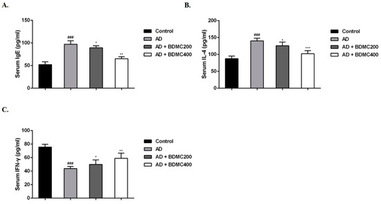 The effect of BDMC on the levels of IgE, IL-4 and IFN-γ in serum. The levels of (A) IgE, (B) IL-4, and (C) IFN-γ in serum were assessed by ELISA. The values are expressed as the means ± SD of three independent samples. ### p < 0.001 vs. control group; * p < 0.05, ** p < 0.01, *** p < 0.001 vs. AD group.