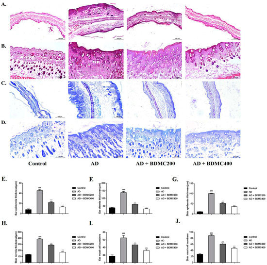 Effects of BDMC on dermal and epidermal thickness and mast cell infiltration were assessed histologically. Histopathological analysis by HE staining (A,B) and toluidine blue staining (C,D) of AD-like skin and ear lesions (magnification, ×100; scale bar, 100 µm). (E–H) The dermal and epidermal thickness was evaluated using HE-stained dorsal and ear tissue microphotographs. (I,J) Mast cells were counted after toluidine blue staining. The values are expressed as the means ± SD of three independent samples. ### p < 0.001 vs. control group; *** p < 0.001 vs. AD group.