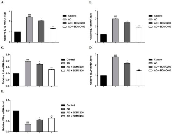 Effects of BDMC on mRNA expression of cytokines in AD-like skin lesions. The mRNA expression of (A) IL-1β (B) IL-4, (C) IL-6, (D) TSLP, and (E) IFN-γ was determined using RT-qPCR. The RNA gene expression levels of each sample were analyzed three times and normalized to the internal control gene GAPDH. The values are expressed as the means ± SD of three independent samples. ### p < 0.001 vs. control group; * p < 0.05, ** p < 0.01, *** p < 0.001 vs. AD group.