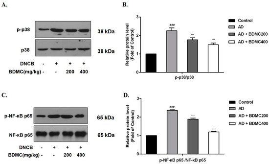 To better evaluate the mechanism of BDMC’s improvement of the skin lesions of the AD mice, the levels of the MAPK-related protein p38 and NF-κB pathway-related protein NF-κB p65 were examined. Our results showed that the phosphorylation level of p38 in the AD group was significantly higher than that in the control group. Further, BDMC prevented the phosphorylation of the p38 protein (Figure 6A,B). However, the effect of BDMC on the JNK and ERK proteins’ phosphorylation remains to be further confirmed. Similarly, the results showed that the phosphorylation level of the NF-κB p65 protein in the AD group was significantly higher than that in the control group. In particular, BDMC prevented the phosphorylation of the NF-κB p65 protein (Figure 6C,D).