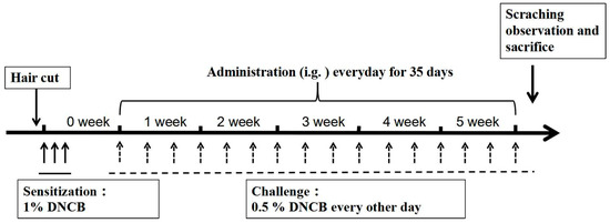 To induce AD-like skin lesions, 32 mice were randomly divided into 4 groups (n = 8) as follows: (1) Control (vehicle treatment), (2) AD (DNCB treatment), (3) AD + BDMC200 (BDMC 200 mg/kg), and (4) AD + BDMC400 (BDMC 200 mg/kg). As previously described [38,39] and depicted in Figure 7, the dorsal skin and right ears of mice were challenged by DNCB. Briefly, we shaved the back hair of the mice in advance. Except for the control group, all mice were sensitized with 200 μL and 30 μL 1% DNCB dissolved in acetone–olive oil solution (3:1) on their back skin and right ears, respectively, for three consecutive days. After 4 days, the back skin and right ears of each mouse were challenged with 0.5% DNCB every other day for 5 consecutive weeks.