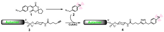 The reagents used in this technique are a 50 mM solution of the copper-TBTA premix, a 280 mM solution of sodium ascorbate in 0.1 M of triethylammonium acetate, a DMSO and a 0.5 mM water solution of aptamer. The reagents were manually mixed in an Eppendorf tube as follows: 20 μL of aptamer solution, 40 μL of copper-TBTA premix, 75 μL of sodium ascorbate, 50 μL of DMSO, 50 μL of tracer solution in DMSO, and stirred on a vortex. After mixing, the reaction mixture was incubated with slow stirring (250 rpm) under heating (37 °C) in aPS100C thermostatically controlled desktop shaker for 15 min. Further purification of the conjugate was not required.