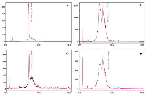 Click reaction with the TBTA ligand. HPLC profiles of precipitated GOL1 conjugate ((A)—immediately after conjugation and (C)—after 2 h) and precipitated GR20 conjugate ((B)—immediately after conjugation and (D)—after 2 h). Conditions: Phenomenex Luna C18 column (5 µm, 4.6 × 250 mm); mobile phase: linear gradient: starting with 100% eluent A (0.1 M triethylammonium acetate in water) and 2% solvent B (acetonitrile) with replacement by 65% eluent A and 45% eluent B at 20 min, flow rate 1 mL/min.