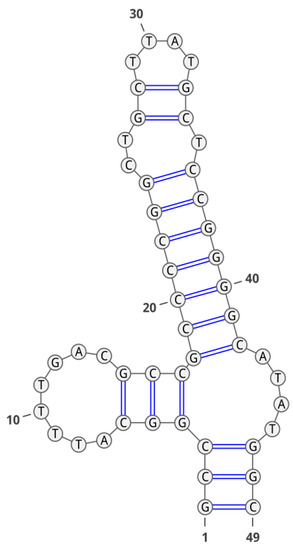 Secondary structure of aptamer GR20 is shown in Figure 5. This aptamer, described in the work of Zavyalova et al. [15], was obtained by truncating the aptamer U31, which was previously selected as showing better affinity for the EGFR and its mutant isoform EGFRvIII [16]. The latter is the most common in glioblastoma and correlates with a poor prognosis for patients [16]. Unfortunately, we failed to obtain a GR20 conjugate of appropriate radiochemical purity and stability using CuAAC without the TBTA ligand and purification on the NAP-5 column (Figure 3C).