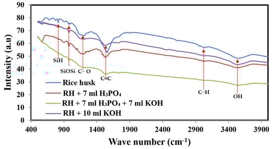 FTIR spectra of prepared sample RH, RH + 7 mL H3PO4, RH + 10 mL KOH and RH + 7 mL H3PO4: 7 mL KOH.
