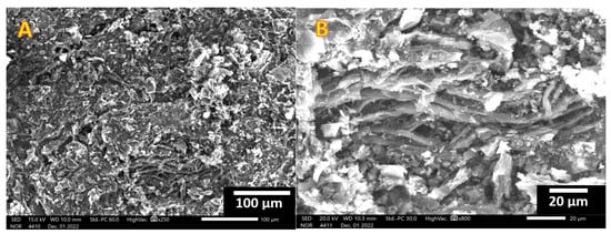 Likewise, phosphoric reveals an interesting performance as an activating agent due to its high tendency to attach with the rice husk and its subsequent decomposition []. As a result, phosphoric acid works as a catalyst for the depolymerization of the lignocellulosic precursor’s constituents into smaller units. Phosphoric acid generates phosphate and polyphosphate bridges that bind biopolymer fragments after chemical activation of lignocellulosic precursors, preventing material contraction due to temperature effects. As a result, the material’s mechanical characteristics are improved [,]