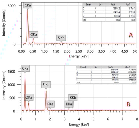 EDS of activated (A) (by 14 mL H3PO4-KOH solution) and pristine (B) carbon obtained from graphitization of the rice husk.