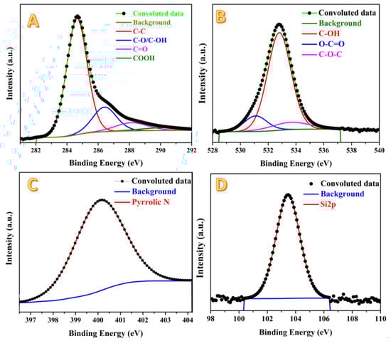 Figure 7 displays XPS analyses for the prepared activated carbon using the combined agent in the chemical activation process. As shown in Figure 7A, in the spectra of the C 1s region, the peaks were de-convoluted into four chemically shifted segments [,]. The first segment at 284.7 eV could be assigned to C–C/C–H non-oxygenated [,]. The interaction of carbon atoms with oxygen in either hydroxyl (C–OH) or epoxide (C–O) functional groups is detected at 286.5 eV in the second segment. The carbonyl (C=O) can be identified in the third segment, at 288.3 eV. Finally, the presence of the carboxyl group (COOH) can be claimed from the fourth segment at 290.2 eV []. As shown in Figure 7B, three segments are observed in the de-convolution of the peak in the O 1s region, namely: C=O (oxygen double bond to aromatic carbon) at 531.1 eV, C–O (oxygen single bond to carbon) at 533.8 eV, and C-OH (carbon single bond to the hydroxyl group) at 532.5 eV []. The nitrogen element is a primary constituent in several kinds of biomasses including rice husk. This hypothesis was confirmed by the XPS analysis as shown in Figure 7B. Typically, the surface of the investigated sample contains pyrrolic nitrogen due to the appearance of a single peak at 400.2 eV that perfectly matches the literature at 532.5 eV []. Silicon is a characteristic element for the rice husk, so silica was extracted from this biomass []. Accordingly, an XPS analysis revealed the existence of an Si element in the investigated activated carbon, as shown in Figure 7D. Typically, at the Si 2p region, a predominant peak at 103.5 eV is observed, representing the Si 2p orbital.