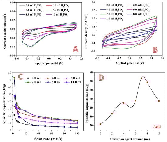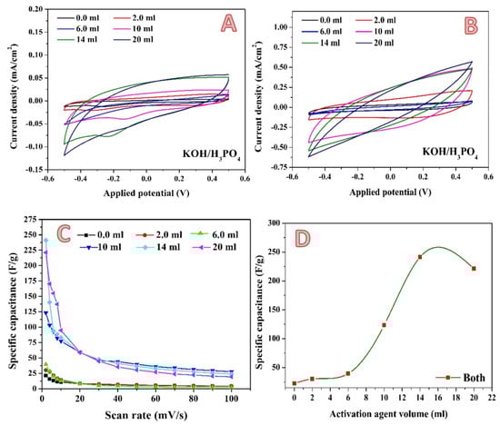 A newly proposed combined activation agent was introduced. As could be concluded from exploiting the phosphoric acid and KOH solution individually, the optimum volume is close, at 7 and 10 mL for the acid and base, respectively. Therefore, the two activation agents have been mixed in a volume ratio of 1:1. Figure 10 shows the electrochemical characteristics of the produced activated carbon. Cyclic voltammetry measurements have been performed at different scan rates in the presence of 0.1 M H2SO4. Figure 10A,B display the results obtained at 2 and 100 mV, respectively, as examples. In contrast to the previous results, in the case of the combined activation agent, an observable jump in the specific capacitance is seen when the activation agent volume increased from 6 to 10 mL, as shown in Figure 10C. Moreover, using the combined activation agent results in a strong increase in the maximum specific capacitance. As seen in Figure 10D, a specific capacitance of 241.3135 F/g was obtained when 14 mL of combined activation agent was utilized. This value is more than two- and three-fold greater when compared to KOH (113.5 F/g) and H3PO4 (73.5 F/g), respectively, which is considered as significant progress. This finding can be ascribed to the unique micro/mesoporous structure of the sample, the abundant surface active sites for adsorption–desorption within micropores, fast ionic transportation channels within the mesopores, and the short diffusion distance of electrolyte ions from mesopores to micropores [].