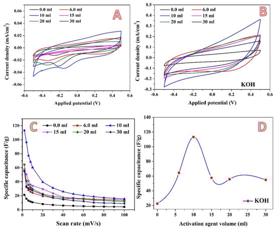 In addition to phosphoric acid, potassium hydroxide has also been widely utilized as an activation agent. Moreover, it was utilized at a commercial level. For instance, the Amoco Corporation has utilized KOH for converting aromatic precursors such as coal and petroleum coke into high surface area carbons (around 3000 m2/g). The Kansai Coke and Chemicals Co. obtained a license to use the method on a pilot plant after it was commercialized in the 1980s. The large surface area of the activated carbon is caused by its mostly microporous structure, and its total pore volume is very high: 2.0–2.6 mL/g [,]. Figure 9A,B show the cyclic voltammograms at 2 mV/s and 100 mV/s for carbon activated by different amounts of 3 M KOH solution. Resembling the phosphoric acid activation, as in the case of KOH, no redox peaks could be seen in the CV results, which indicates absence of pseudo-capacitance in the investigated samples. As previously discussed, the specific capacitance is inversely proportional with the scan rate, as shown in Figure 9C. The increase in scan rate limited the ions’ accessibility to the electrode surface. This phenomenon could be related to the ion sieving effect, where the ultrafine pores in treated AC could only be accessed at a slow diffusion rate [,]. Compared to H3PO4-activated carbon, which reveals a highest specific capacitance value of 73.5 F/g at 7 mL utilized solution, the maximum specific capacitance in the case of utilizing KOH as an activation agent is higher. As shown in Figure 9D, a highest specific capacitance value of 113.24 F/g is obtained when the volume of the used alkali solution was 10 mL. However, a greater increase in the activation agent solution volume does have a negative impact on the specific capacitance.