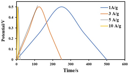 The electric double layer capacitance (EDLC) was tested at constant current charge/discharge regimes (between 1 and 10 A/g) within the voltage range from 0 to 0.5 V in 0.1 M H2SO4. The galvanostatic charging/discharging analysis (GCD) is an important electrochemical for the supercapacitors electrodes. Figure 11 displays the GCD curves of the sample showing the maximum specific capacitance (activated by 14 mL combined activation agents) at different current densities; 1, 2, 5 and 10 A/g. It can be observed that the charge–discharge curves of the prepared activated carbon electrode are of an approximately symmetrical triangular shape with a linear voltage versus time profile. The introduced activated carbon from rice husk shows maximum discharge times, either at high or low current densities, indicating the best electrochemical performance []. Moreover, the nearly symmetric triangle shape of the obtained charge and discharge curves indicates that the proposed electrode has high reversibility at high current loadings []. In addition, only a slight IR drop is observed at high current loading, which reveals the high rate capability and small internal resistance []. For the other samples, the measurements have been conducted and similar behaviors were obtained for both acid and alkali–activated samples (data are not shown). As mentioned in the CV discussion, the capacitance of the introduced activated carbon cannot be considered as redox capacitance. Therefore, based on CV and GCD results, it can be claimed that the capacitance is related to electric double layer capacitance.