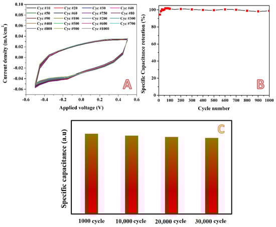 Cyclic voltammetry (selected cycles from 1000 cycles) for the electrode obtained from activation using H3PO4/KOH combined solution (14 mL) in 0.1 M H2SO4 at scan rate 2 mV/s and 25 °C; (A), and specific capacitance retention; (B). Panel (C) displays the specific capacitance retention after 30,000 cycles within a potential window of −0.2 to 0.2 V (vs. Ag/AgCl) at a scan rate of 10 mV/s using 0.1 M H2SO4 electrolyte.