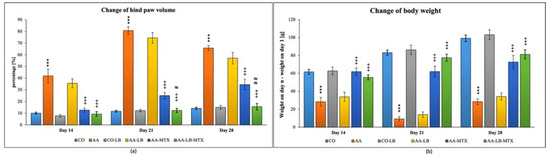 In our experiment with Lewis rats, we chose two biometric parameters for describing the development of experimental arthritis and further for evaluation of the treatment effectiveness. Figure 1 presents the obtained data for the change of hind paw volume (cHPV) (Figure 1a) and the change of body weight (cBW) (Figure 1b). The arthritis was already developed on day 14. For both parameters, we obtained significant differences between arthritis and healthy animals. For cHPV we observed an increase in this parameter for animals suffering from arthritis compared to the healthy control group (Figure 1a). In contrast, for cBW we observed a decrease (Figure 1b). After 1 week, in the case of both parameters, were the differences between healthy and arthritic animals even more profound, which is in accordance with the acute phase of the arthritis development in AA. During the chronic phase of arthritis, which is apparent on experimental day 28, we observed regression of the differences between AA and healthy control animals. The administration of LB to healthy control did not show any effect on monitored biometric parameters. LB administered to arthritic animals slightly improved both parameters, but it had a more visible effect for cHPV than cBW during the whole experiment (Figure 1a,b). The administration of MTX in monotherapy caused significant alleviation of biometric parameters in arthritic animals compared to untreated animals. LB administered in combination with MTX caused improvement in the therapy efficacy for both biometric parameters and all experimental days (Figure 1a,b). Moreover, we measured significant change for cHPV on experimental days 21 and 28 (Figure 1a).
