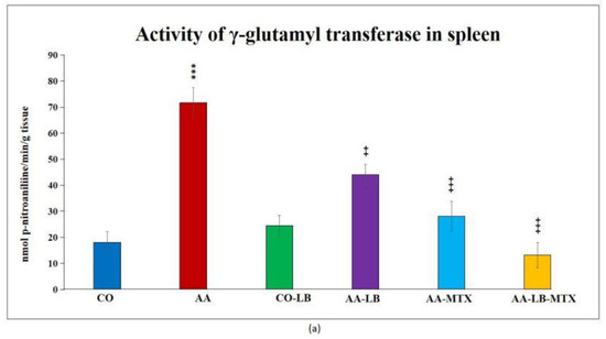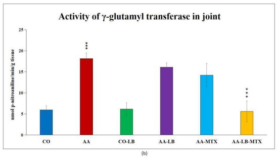 At the end of the experiment, we collected relevant tissues to monitor gamma-glutamyl transferase (GGT) activity. Although the values were elevated differently in the studied tissues (higher values were measured in the spleen compared to joint tissue), significant differences were shown between arthritic and healthy animals (Figure 2a,b) in both analyzed tissues. Again, as for biometric parameters as for the activity of GGT, it did not prove any change in control groups administered with LB compared to untreated healthy controls. In both tissues, we could observe the same pattern in decreasing the GGT activity after administration of LB to arthritic animals in monotherapy as well in combination with MTX: the highest activity was measured in AA-LB group, following AA-MTX. The combination therapy (AA-LB-MTX) decreased the activity of GGT most effectively and significantly.