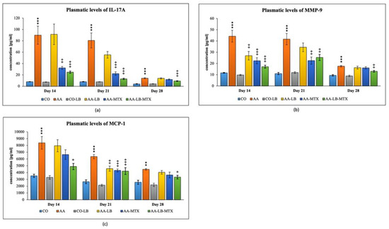 We selected three different inflammatory markers to evaluate the intensity of inflammation and its modulation by the studied therapy. In arthritic animals, the concentration profile for metalloproteinase-9 (MMP-9) and monocyte chemotactic protein-1 (MCP-1) in plasma follows a decreasing trend from day 14 to day 28 (Figure 3b,c). On the other hand, for interleukin-17A (IL-17A), we observed a different pattern with the peak on day 21 and minor differences apparent on day 28 (Figure 3a). All parameters were not changed if we compared the healthy untreated group and the healthy group treated with LB (Figure 3a–c). In the case of IL-17A, the administration of LB improved the elevated concentration in arthritic animals only on day 21 during the acute phase of AA, however the significance was not proved. MTX was effective in lowering the IL-17A concentrations for the first two experimental weeks but not on day 28. The combination with LB significantly lowered IL-17A levels during the whole experiment (Figure 3a). For arthritis, increased concentrations of MMP-9 and MCP-1 in plasma were affected therapeutically mainly at day 14. The increasing efficacy was in this order: AA-LB followed by AA-MTX and AA-LB-MTX. The addition of LB to MTX caused therapeutic improvement, although not significantly between AA-MTX and AA-LB-MTX (Figure 3b,c). MMP-9 was further improved on day 21 by MTX and its combination with LB. However, on day 28, only the combination therapy was effective (Figure 3b). MCP-1 on day 21 was decreased comparable in all treated groups, with significance for AA-MTX and AA-MTX-LB. A slight difference between the healthy control and arthritic group on day 28 was found. Similarly, there were no differences among treated groups of arthritic animals (Figure 3c).