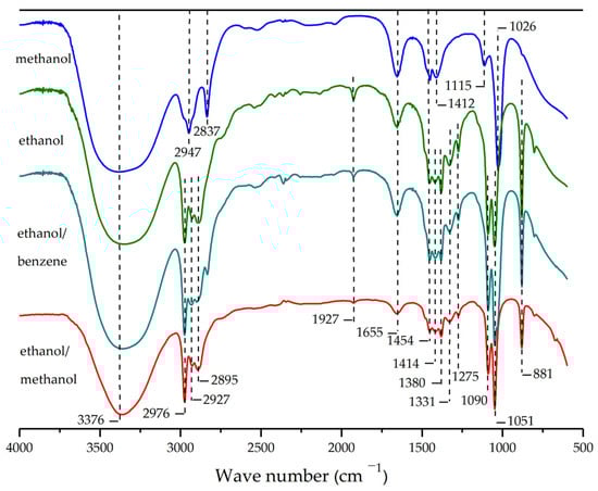 All spectra exhibit similar spectral signatures, except for differences in infrared absorption intensity. Typical aromatic bands of lignin were at 1655 and 1454 cm–1 (Figure 1) []. These samples were rich in carbon, because the transmission intensity of each peak gradually increases as the type of carbon changes. In contrast, the number of absorption peaks in S. holocarpa wood ethanol, ethanol/benzene and ethanol/methanol extracts were greater than in S. holocarpa wood methanol extract, and absorption peaks were associated with –CH3 bonds []. The FT–IR spectrum showed no –C≡C– vibrations at 2140–2100 cm–1, indicating the absence of a C≡C functional group in S. holocarpa wood (Figure 1). Another possible reason is that during the extraction process, some chemical bonds become unstable, or condense under high temperature conditions []. In general, the main chemical components of S. holocarpa wood samples characterized by FT–IR testing include phenols, alcohols, acids, and hydrocarbons. The absorption peaks of the four sample extracts were mainly distributed at 3800–3030 cm–1, 3030–2835 cm–1, and 1500–881 cm–1.