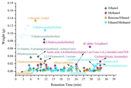 GC–MS detection results show that 15, 37, 27 and 44 chemical components were identified from four extracts of S. holocarpa wood, which were ethanol, methanol, benzene/ethanol, and ethanol/methanol, respectively (Figure 2). More specifically, they were as follows: 2-furanmethanol (1.37%), dihydroxyacetone (8.88%), 5-hydroxymethylfurfural (20.26%), 1,2,3-propanetriol, 1-acetate (6.55%), D-galactose (2.84%) (Table S1). Furfural (4.99%), butyl 2-acetoxyacetate (5.47%), 4-nonanol (2.36%), sucrose (4.91%), dl-.alpha.-tocopherol (20.75%) (Table S2). 1-hexanol, 2-ethyl- (47.63%), butyl 2-acetoxyacetate (4.01%), dibutyl phthalate (4.72%), 4-((1E)-3-hydroxy-1-propenyl)-2-methoxyphenol (3.94%), 2-propenoic acid, 3-(4-hydroxy-3-methoxyphenyl)- (0.56%) (Table S3). 2-furanmethanol (1.48%), ethanone, 1-(2-hydroxy-5-methylphenyl)- (3.04%), n-hexadecanoic acid (2.23%), linoelaidic acid (3.86%), 1,4-bis(trimethylsilyl)benzene (4.68%) (Table S4).