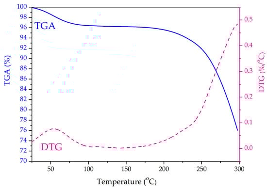 Analysis of the 1 mg 200 μm powder was performed on a Perkin Elmer–STA8000 (Waltham, MA, USA) instrument. The temperature was set to rise from 30 °C–300 °C at the rate of 5 °C/min. The carrier gas rate was set at 60 mL/min and the gas used was nitrogen [].