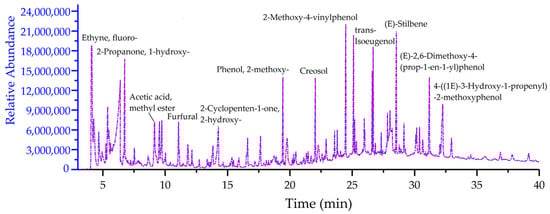 A total of 214 compounds were identified based on Py/GC–MS results (Figure 4). Among the compounds, the products of S. holocarpa wood pyrolysis at 500 °C were: ethyne, fluoro- (5.96%), dihydroxyacetone (4.22%), acetaldehyde (3.31%), ethyl ether (2.81%), hexadecanenitrile (2.33%), 2-propanone, 1-hydroxy- (2.11%), methyl glyoxal (2.07%), furfuryl alcohol, tetrahydro-5-methyl-, cis- (2.05%), etc. (see Table S5).