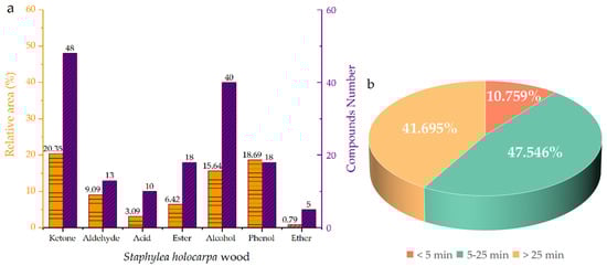 Classification (a) and temporal (b) distribution of pyrolysis products from S. holocarpa wood.