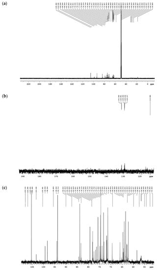 Organic elements are the skeleton of carbon, currently 13C–NMR spectroscopy is used to study the structure of sample changes through carbon atoms to understand the structure of organic compounds. Since some of the functional groups in the organic compound do not contain hydrogen atoms, these functional groups cannot be obtained from the 1H spectrum and can only be obtained from the 13C spectrum (Figure 7). For carbohydrates, the polymer carbon is mainly distributed in the 50–110 ppm region []. The carbon spectrum of saturated hydrocarbons, partial alkynes and partial olefins were mainly distributed between 15–45 ppm and 75–55 ppm. The carbon spectrum containing halogen elements (C-I: 0–40 ppm; c-bromine: 25–65 ppm; C-ci: 35–80 ppm) and the carbon spectrum of aromatic and olefins (=C–: 100–150 ppm; C6H6: 110–160 ppm) were mainly distributed between 0–80 ppm and 10–160 ppm. The signals at 20.3 ppm and 172.9 ppm shifts were mainly assigned to hemicellulose acetyl [,,].