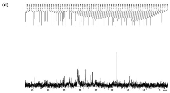 The 1H–NMR spectrum of the nuclear magnetic resonance spectrum is the most widely used. It not only offers high magnetic detection sensitivity, but the signal is easy to observe; organic compounds provide a large number of hydrogen atoms in a variety of chemical environments. As can be seen from Figure 6, the overall displacement ranges from 0–8 ppm. Typically, the chemical shifts of the protons were saturated at δ 0.2 to δ 1.5 alkane compounds; usually, the first proton appears at about δ 0.9, the second proton appears at δ 1.3, and the third proton appears at δ 1.5 []. Generally, the proton chemical shift of the carbon atom directly connected to the halogen between 2.0 and 4.5, and the influence of the proton on the adjacent carbon atom was significantly decreased. The chemical shift of α–C protons near carbonyl or cyano was 2–3 ppm, which was caused by the anisotropic effect of C=C and sp2 hybridization of internal changes in olefin carbon. The chemical shift in the range of 4.5–5.9 ppm belongs to olefin compounds, and the δ value increases after coupling with the aryl group []. Chemical shifts of 1.7–3.5 ppm were alkyne carbon protons. The chemical shifts of the carbonyl α-H belong to carbonyl compounds between 2 and 2.7 ppm, and the chemical shifts of the acid compounds range between 2 and 2.6 ppm. Displacement in the 3.3–4 ppm range is mainly caused by α-H hydrogen atoms in the ether molecule. The chemical shift of the α-H hydrogen atom in the alcohol molecule was 3.4–4 ppm, and the displacement of ester compounds and phenolic hydroxyl protons was 2–4.1 ppm and 4–8 ppm, respectively. The aromatic compound chemical shifts range from 6.3 to 8.5 ppm, and the heterocyclic aromatic protons range from 6.0 to 9.0 ppm [].