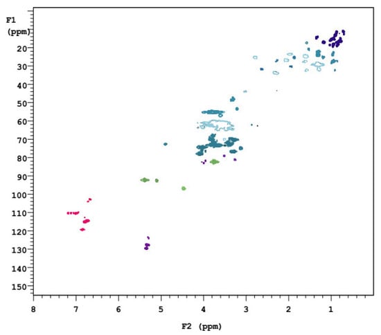 In order to further understand the sample structure in more detail, 2D–HSQC NMR analysis was also carried out in this study. 2D–HSQC NMR is currently one of the most widely used technologies. Its ability to categorize functional groups clearly from 2D–HSQC maps provides an important structural shift in the sample and provides a resolution of overlapping signals in both 1H and 13C–NMR spectra, and analysis of two different aromatic groups []. In Figure 8, the aliphatic region of the HSQC spectrum was located at δC/δH10–40/0.5–2.5, the side chain was at δC/δH50–95/2.5–6.0 and the aromatic was at δC/δH95–135/5.5–8.0 []. δC/δH92/5.3, δC/δH96/4.4δC/δH102/6.6, δC/δH110/6.9, δC/δH115/6.7, and δC/δH120/6.8. These chemical shifts indicate the interconnection between hydrogen atoms and carbon atoms []. As can be seen from the 2D–HSQC NMR chart, the linking of saturated hydrocarbons was at δC/δH15–45/0.2–1.5, the carbon spectra of partial alkynes and alkenes were δC/δH55–75/1.7–3.5, 4.5–5.9, and the aromatic and olefinic carbons are located at δC/δH110–140/6.3–8.5, 4.5–5.9, while the remaining alcohols, ethers, phenols and other oxygenates are located at δC/δH 60–80/3.3–4 [,].