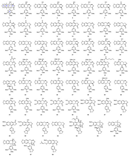 Some seco-podophyllotoxins existed in plants (Figure 2). Compounds 59–66 were C ring cleavaged derivatives. Yatein (59) was a common constituent which has been found in species Juniperus chinensis, Bursera simaruba and Hernandia nymphaefolia, et al. [49,50,51]. Compounds 60 and 61 were the demethyl or methoxy derivatives of yatein (59). These two compounds had been isolated from Juniperus sabina and Hernandia peltata. Nemerosin (62) was isolated from Anthriscus sylvestris through a bioassay-guided isolation method, but was reported to be less active than podophyllotoxin-type compounds [52]. Bursehernin (63) was another common seco-podophyllotoxin existing extensively in genera Hernandia [53,54]. Compounds 67–71 were D ring opened derivatives.